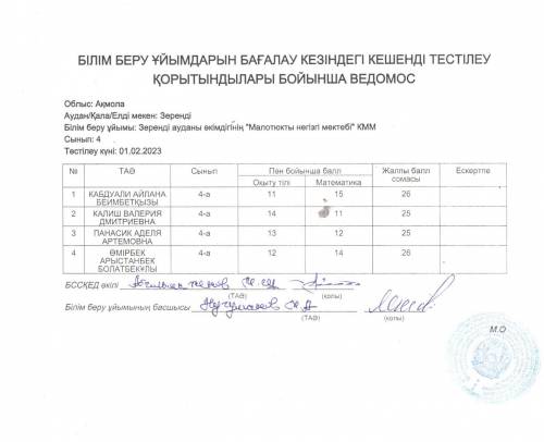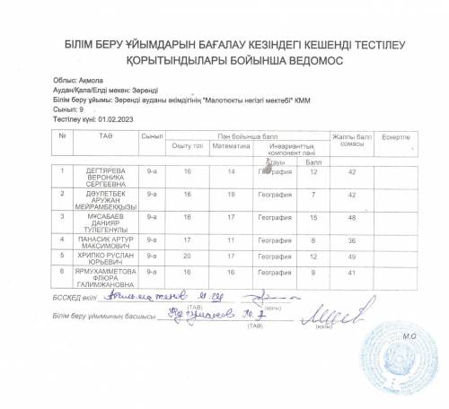 Әдістемелік ұсынымдарға 13-қосымшаға сәйкес толтырылған кестелерді қоса алғанда, 4,9-сынып оқушыларының білім, білік және дағдыларының сапасын бағалау нәтижесі.