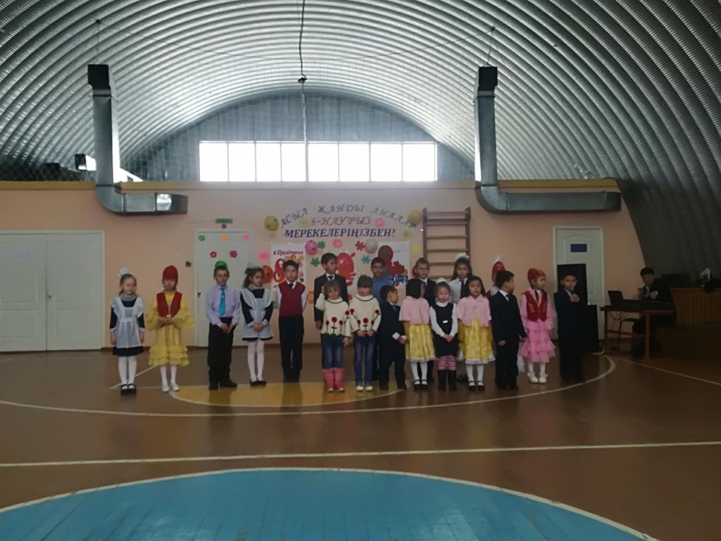 Өнерлерін аналарға бағыштайды, — дей келе ортаға бастауыш сынып оқушыларының сіздерге арналған тартуларын қабыл алыңыздар. Барлығы хормен «Мерекелеріңізбен» деп айтады.